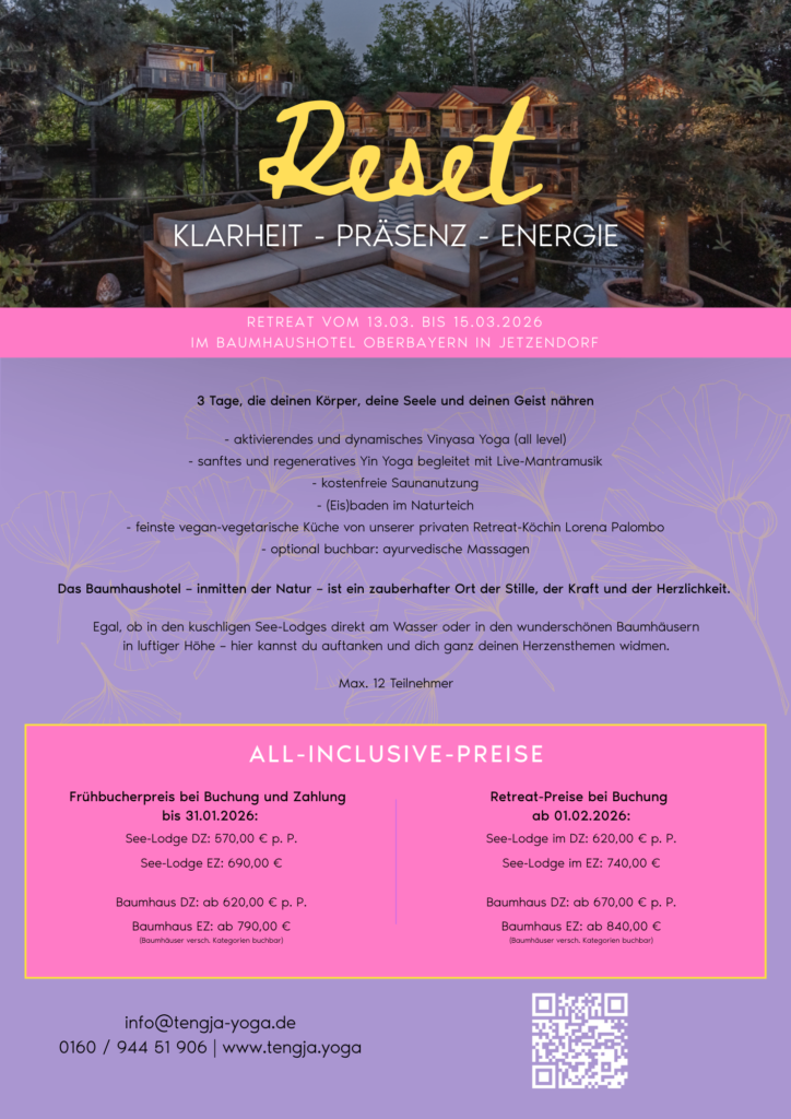 Das Baumhaushotel-Oberbayern bietet alles, was wir für ein perfektes Yoga-Wochenende brauchen. Im nagelneuen Yoga-Pavillon mit weiten Glasfronten hast du einen ungehinderten Blick in die Natur. Hochwertige Matten, Blöcke, Bolster und Decken liegen bereit und warten auf deine Teilnahme.